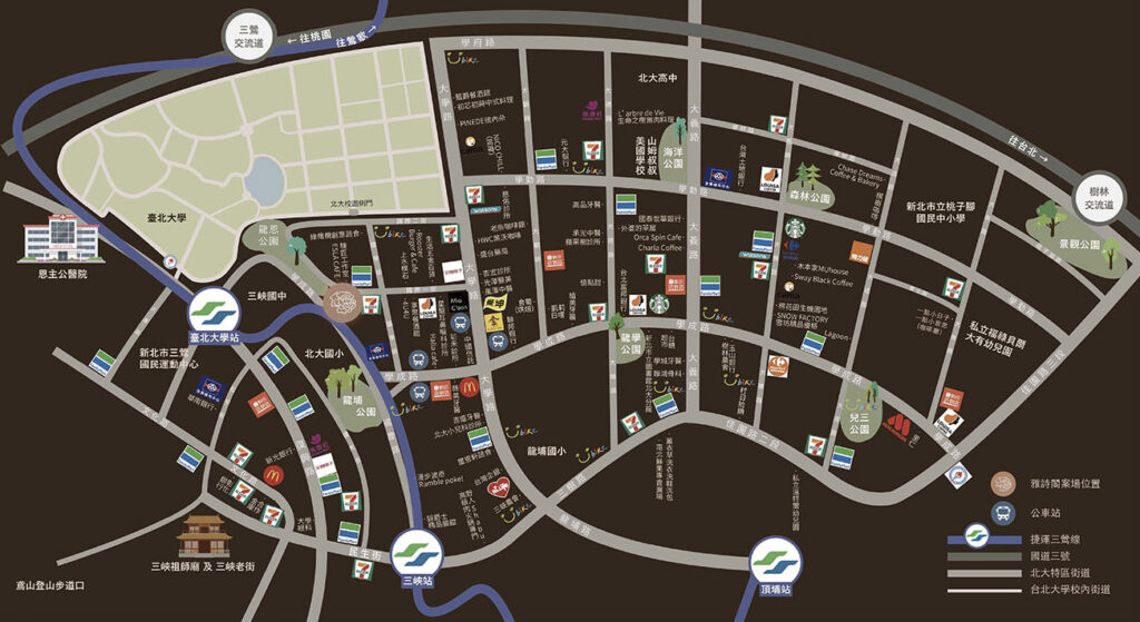 開車走國道2號 30分鐘可到達信義計畫區 35分鐘可到達南港展覽館 20分鐘可到達桃園機場 坐公車17線 可直達信義計畫區 板橋、土城、中和、樹林、桃園 搭捷運台北大學站可接台北捷運藍線 預計2025年通車